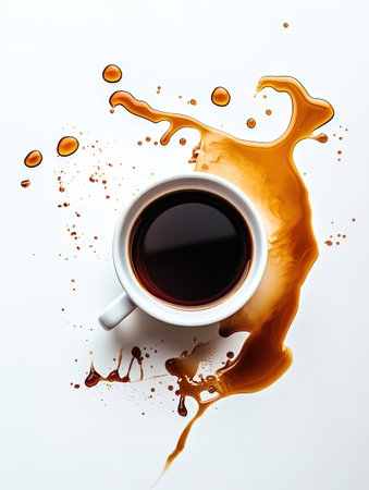 Spilled cup of coffee on white table shot from above