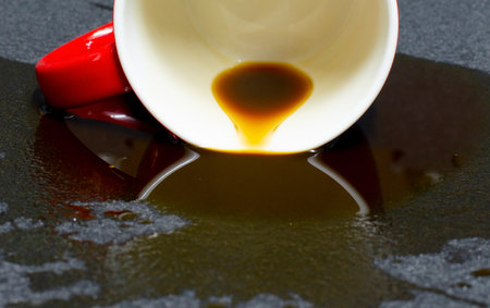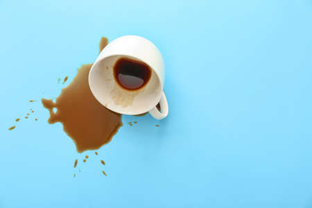 Overturned cup and spilled coffee on table
