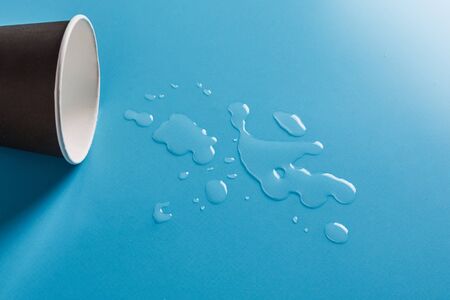 Dark Paper cup with abstract drops of spilled water on blue background. Spilled drink cup concept.