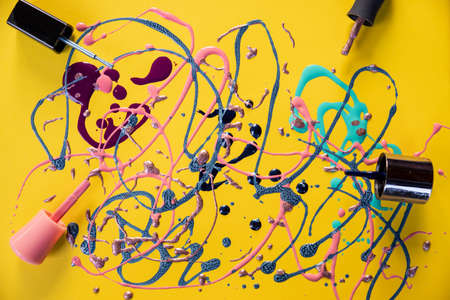 Nail colors ,enamel, mixed multicolor samples, isolated on colorful background.Spilled bright nail polishes, manicure concept.Blots of nail polish.art set, creative design. Copy space