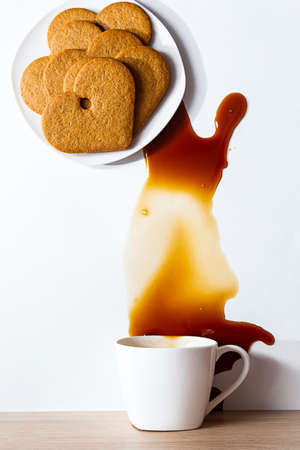 Modern still life of heart shaped gingerbread cookies on a plate and a cup of coffee spilled on the table.
