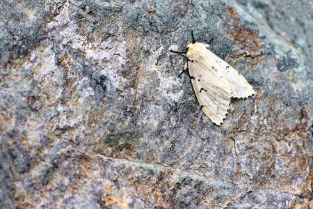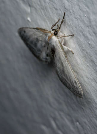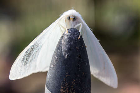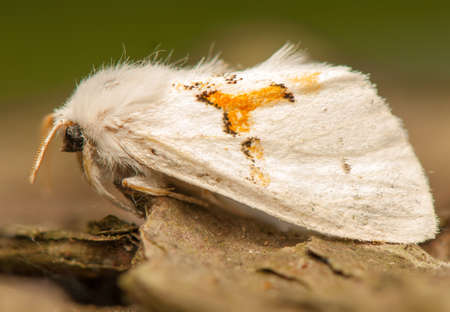 Natural detailed closeup on the white ermine, Spilosoma lubricipeda sitting on wood