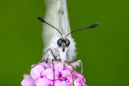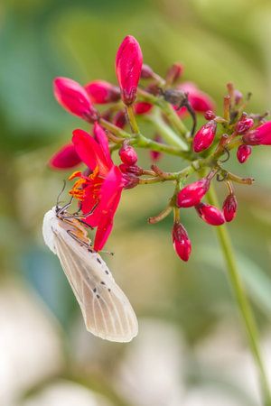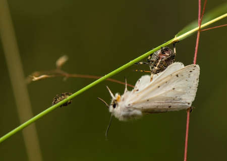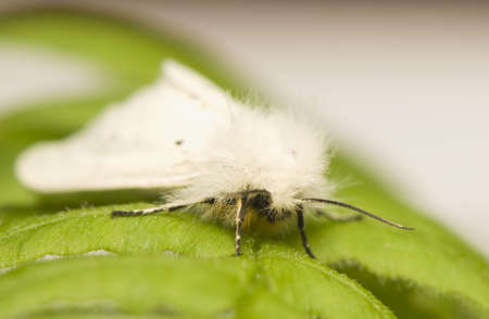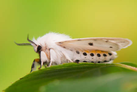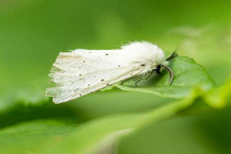 White moth, spilosoma urticae green leaf, macro insect, green background, black antennae