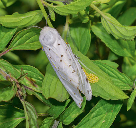 the salt marsh moth or acrea moth - Estigmene acrea - laying small yellow eggs on a dotted horse mint or bee balm - Monarda punctata - white moth black spots fuzzy and cute