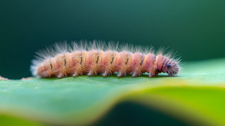 A fuzzy caterpillar with a soft peach hue and dark stripes traverses a broad green leaf. The shallow depth of field emphasizes its delicate, hairy form.