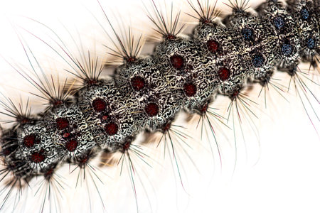 Overhead close up of the Caterpillar of a Lymantria dispar, the gypsy moth against a white background