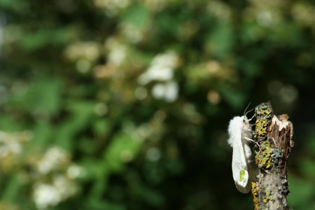 Beautiful moth on wooden twig outdoors, closeup. Space for text