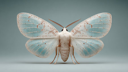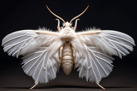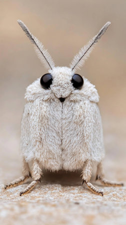 Close up of a fuzzy white moth showcasing intricate details, including large black eyes and delicate antennae on a neutral background Ideal for nature and insect studies