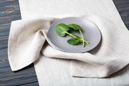 Fresh spinach leaves on a grey plate on a linen tablecloth