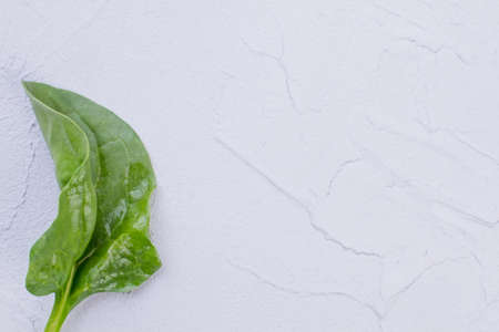Raw fresh spinach leaves on a stone table. White background. Top view. Copy space.