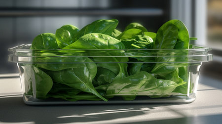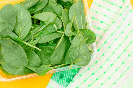 Fresh Baby Spinach Leaves in Transparent Plastic Package on Yellow Background - Top View. Vegan and Vegetarian Culture. Raw Food, Green Leaves. Healthy Diet