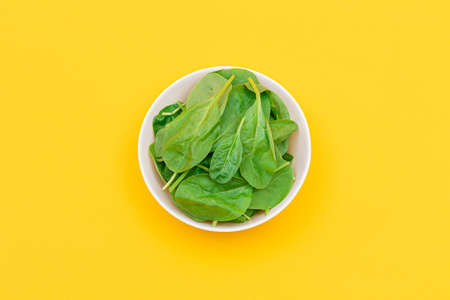 Fresh Baby Spinach Leaves in White Bowl on Yellow Background - Top View. Vegan and Vegetarian Culture. Raw Food, Green Leaves. Healthy Diet