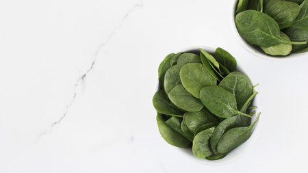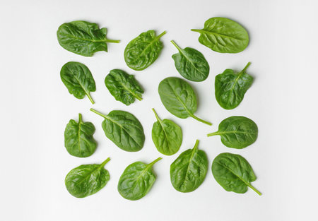 Young green spinach leaves on a white background, top view, copy space. Clean food, detox, diet food ingredient - green organic spinach
