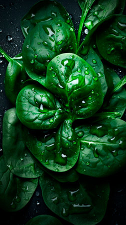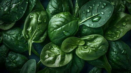 Spinach fresh green leaves with water drops on a black background, top view. Healthy food, salad vegetable herbal ingredient. Wet spinach