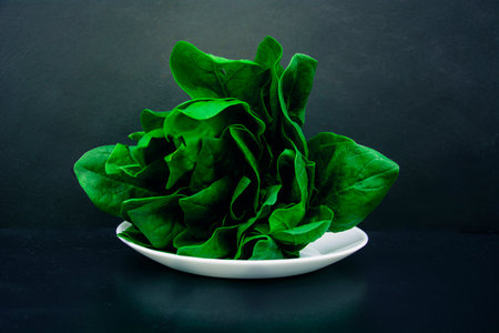 Bunch of fresh green leaves of spinach on a white plate on a black background