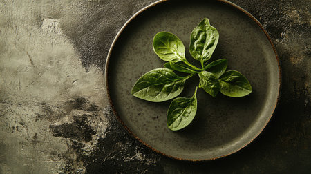 Fresh baby raw spinach on a plate. Copy space. Healthy eating.
