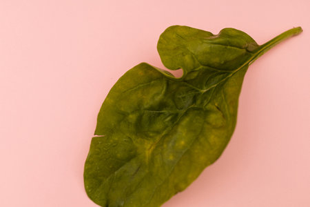 top shot close-up soft pink background green spinach leaves high energy content healthy wholesome food spring salad veins in leaves vegan food