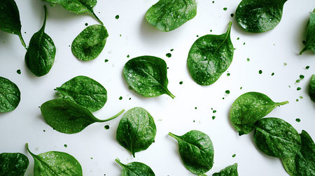spinach leaves on white background, pattern. Top view