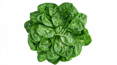 A top-down view showcases a healthy bunch of fresh spinach with its deep green, crinkled leaves. The vibrant produce is neatly arranged on a stark white surface.