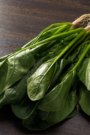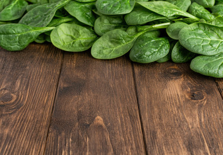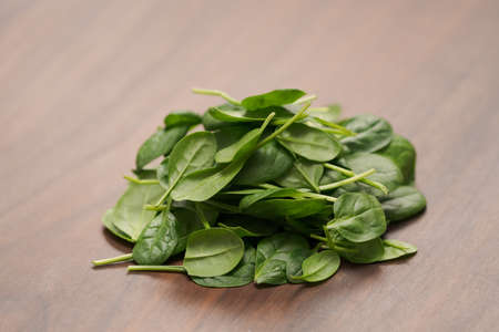 Fresh spinach leaves on walnut wood table
