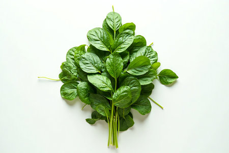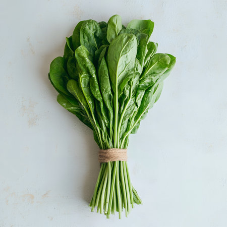 Fresh spinach bundle displayed on a white surface against a light background showcasing vibrant greenery and earthy texture