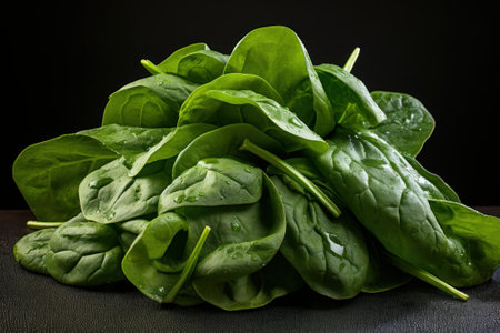 Fresh Green Spinach Leaves on a black background, Inviting Culinary Creativity, Healthy Eating Concepts, and Vibrant Visual Storytelling with Copy Space. High quality photo
