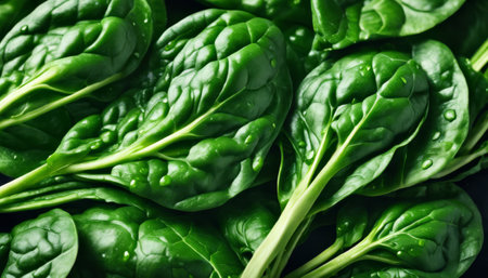 A close-up view of fresh, vibrant green spinach leaves glistening with water droplets, arranged on a dark, textured surface. Clear details and vibrant colors enhance visual appeal.