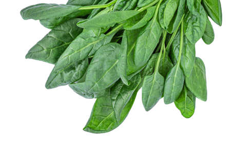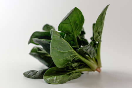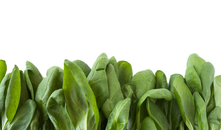 Close up of fresh green spinach leaves isolated on white background. Healthy food concept.