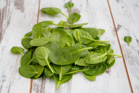 Spinach leaves on a wooden white table. Nutritious and healthy vegetable greens.