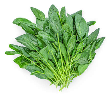 Bundle of Fresh Spinach isolated on white background. Spinach leaf Macro. Top view. Flat lay.