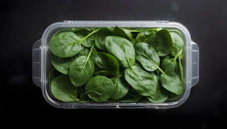 Fresh Baby Spinach Leaves in Transparent Plastic Package on black Background