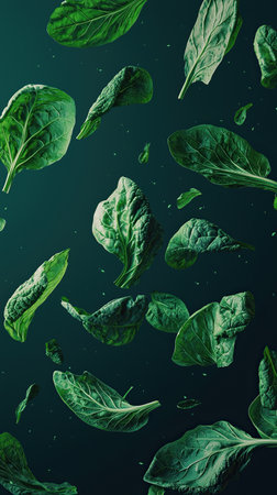 Flying Spinach and Swiss Chard in green background, showcasing vegetables levitating
