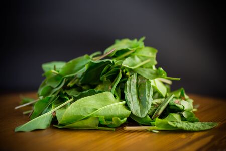 fresh cut organic sorrel leaves on a wooden table