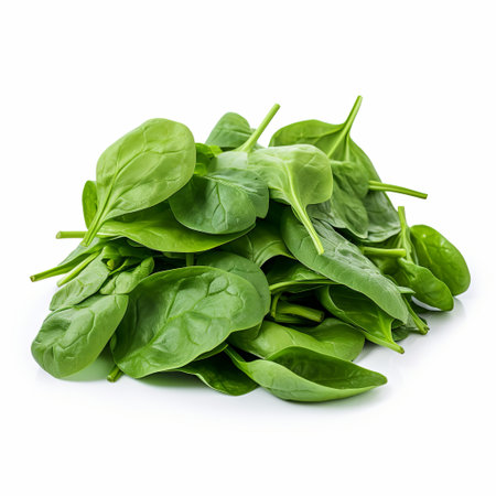 Fresh, vibrant green spinach leaves are arranged in the corner of a clean white background.