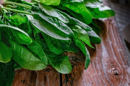 Fresh green spinach on the dark wood background.