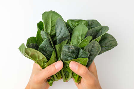 Young green spinach leaves on a white background, top view, copy space. Clean food, detox, diet food ingredient - green organic spinach