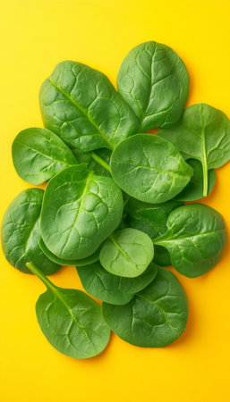Fresh Spinach Leaves, Vibrant Green, Isolated on Yellow Background, Healthy Eating, Food Photography