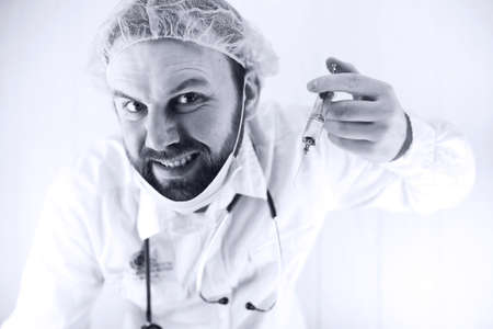 Black and white photo of bearded doctor in white coat and an old syringe