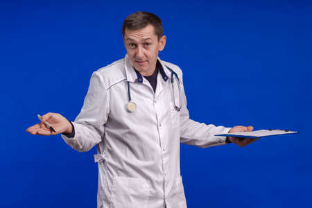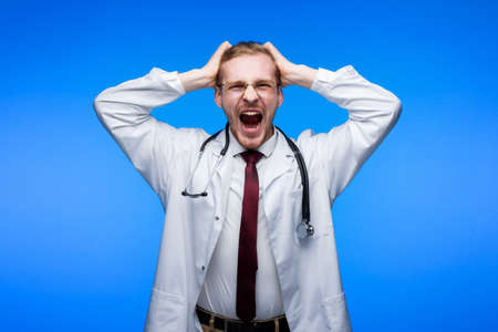 emotional adult male doctor in a white coat posing on a blue background