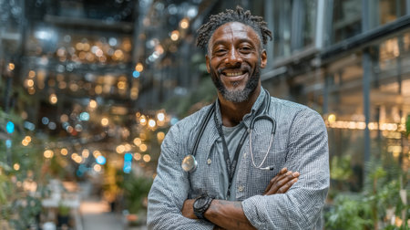 Professional black doctor standing confidently in modern hallway with glowing, warm light ambiance.