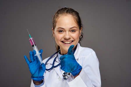 Young beautiful woman on gray background with glasses and medical dressing gown drains syringe and stethoscope, medicine, doctor.