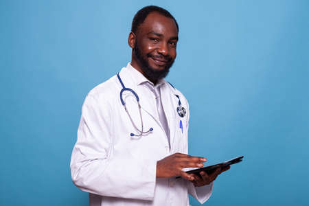 Portrait of medical doctor with stethoscope smiling at camera holding touchscreen tablet wearing hospital uniform. Happy medic in lab coat using digital device.
