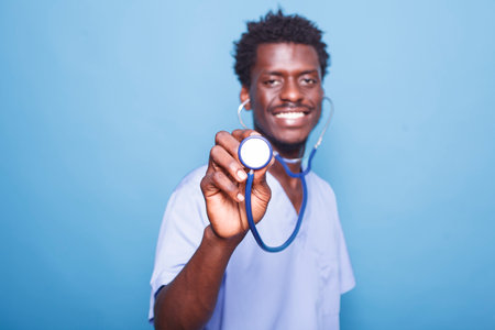 Close-up of African American healthcare specialist holding a stethoscope towards camera. Smiling black nurse in uniform grasping a medical instrument for heart or lung examination.