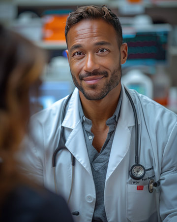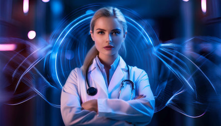 A close-up captures a medical professional in a lab coat and stethoscope. The image showcases the subject's face, curly hair, and the details of the uniform against a dark background. It conveys a sense of expertise and care, suitable for medical publications and healthcare-related advertising.
