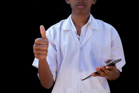 Asian doctor with stethoscope around his neck with thumb up hand stand on black background.