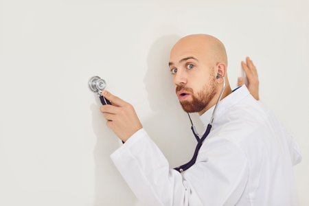 Portrait of a funny young male doctor in uniform standing with stethoscope putting it to a white wall in medical clinic with copy space and looking at camera. Medicine and health care concept.