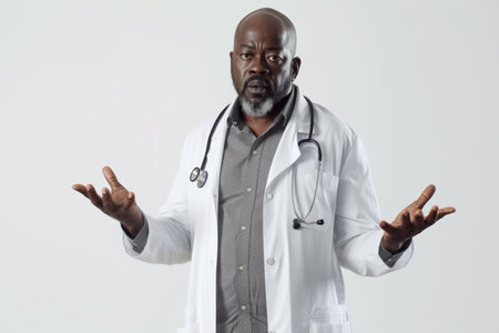 An African American internist stands and spreads his arms to the sides on a white background.