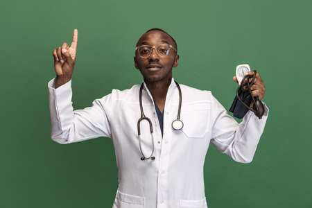 Image of african young doctor, therapeutic or medical advisor isoalted on green background. Concept of healthcare, care and medicine. Close-up