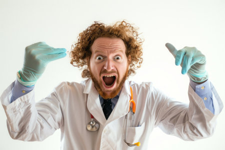 Excited doctor with curly hair expresses enthusiasm wearing medical gloves.