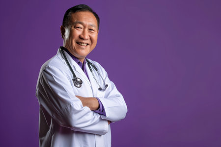 A doctor stands with arms crossed, showcasing a confident expression. Dressed in a white lab coat, he embodies professionalism and experience against a neutral gray backdrop. Copy space.